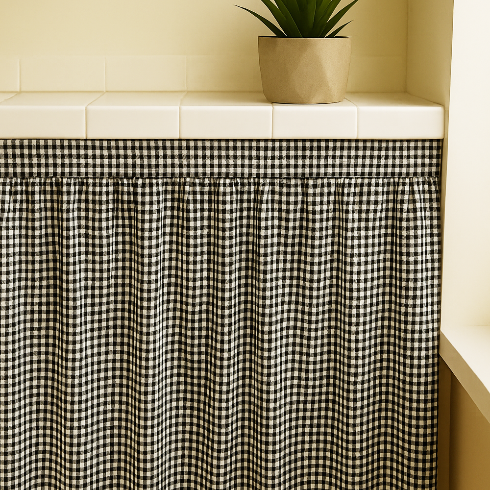 Cette jupe est équipée d’une fixation auto-agrippante très pratique : un côté avec bande adhésive à coller sur la surface, l’autre cousu sur le rideau. Pas besoin d’accessoires supplémentaires : décollez la protection de l’adhésif, collez-le sur le cadre, fixez votre rideau… et c’est prêt !